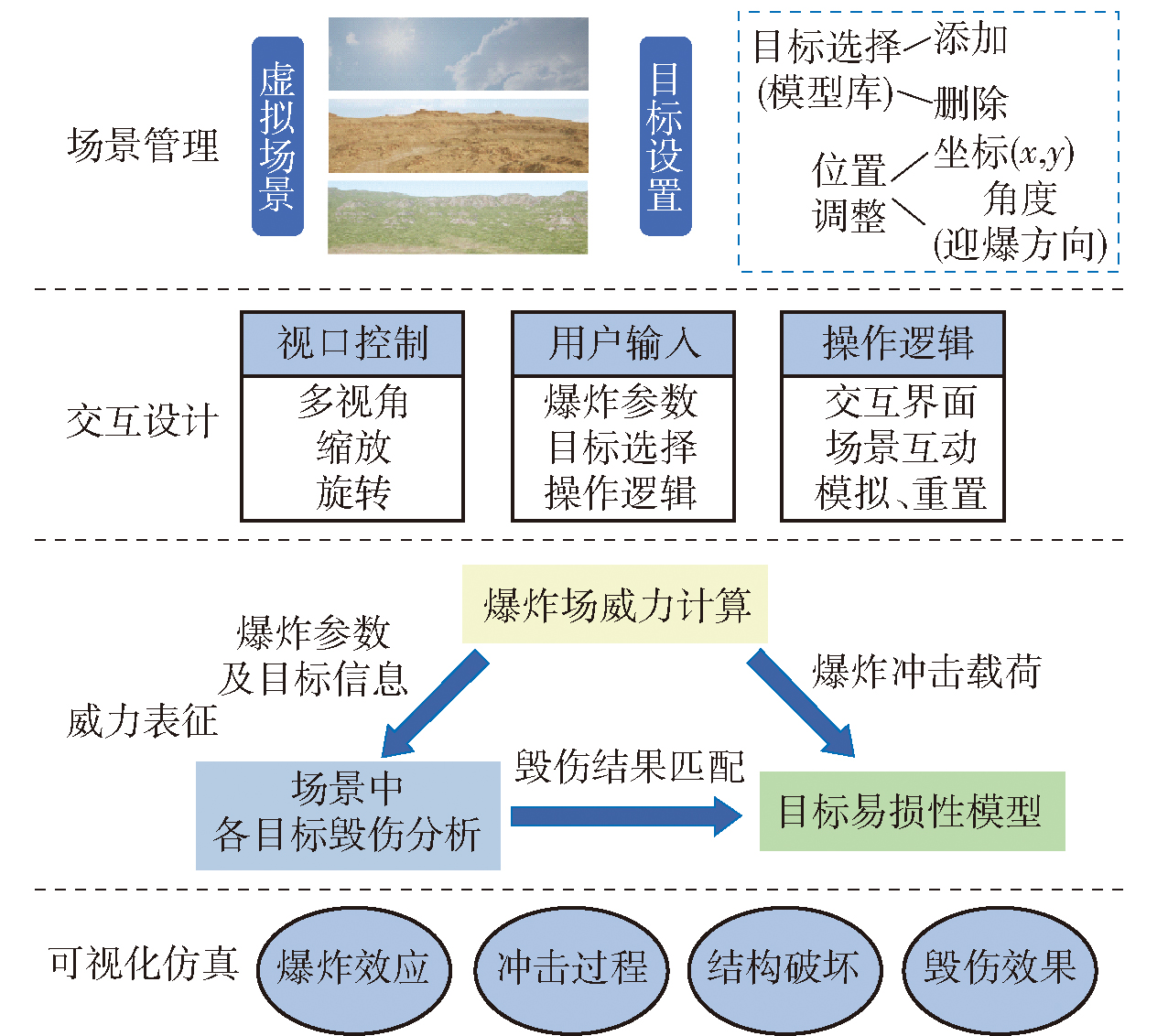 关键词: 虚拟仿真, 快速可视化, 爆炸冲击波, 易损性, 毁伤效应