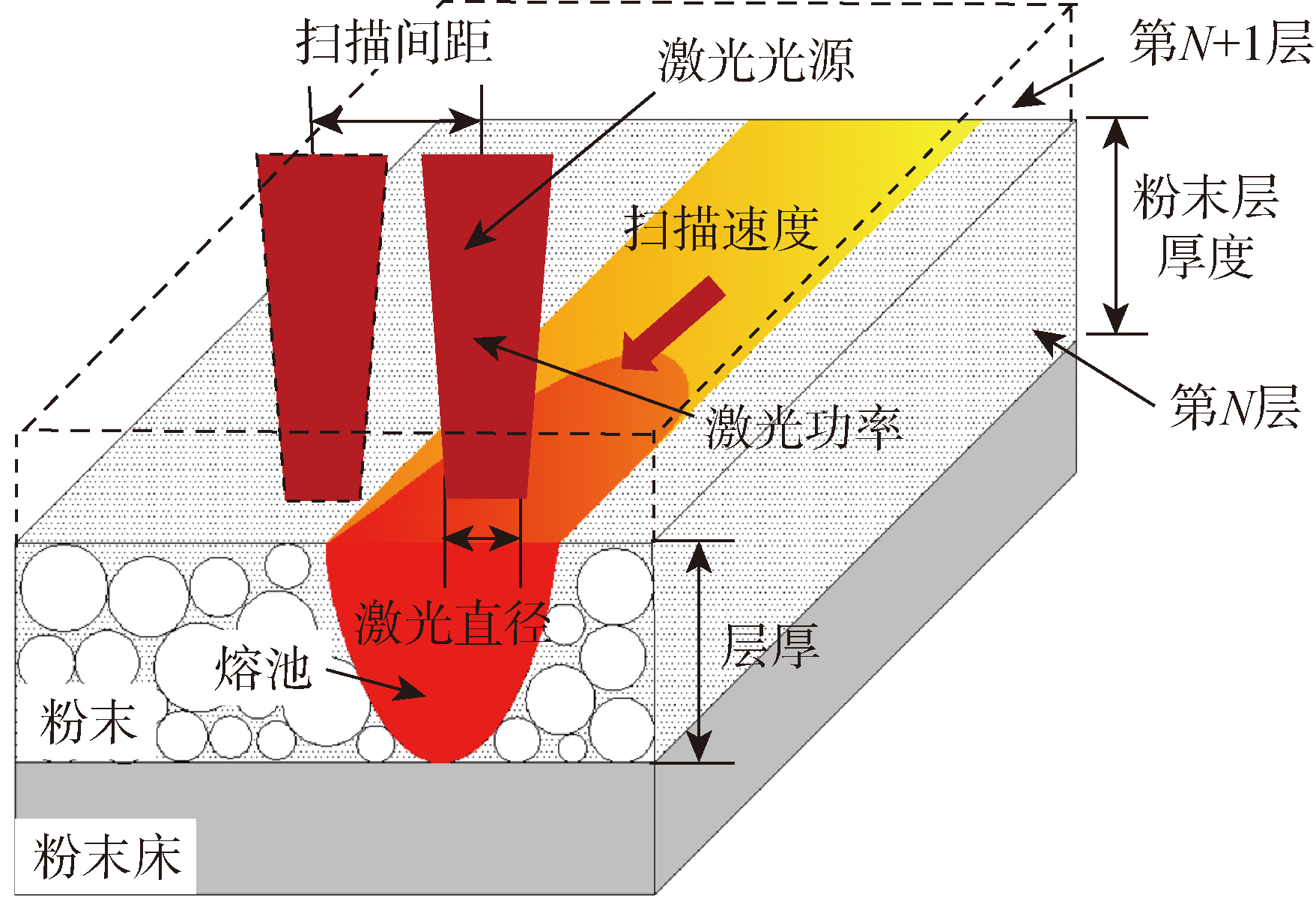 | 激光功率 P/W | 扫描速度V/ (mm·sec-1) | 激光直径D/ mm | 扫描间距H/ mm |