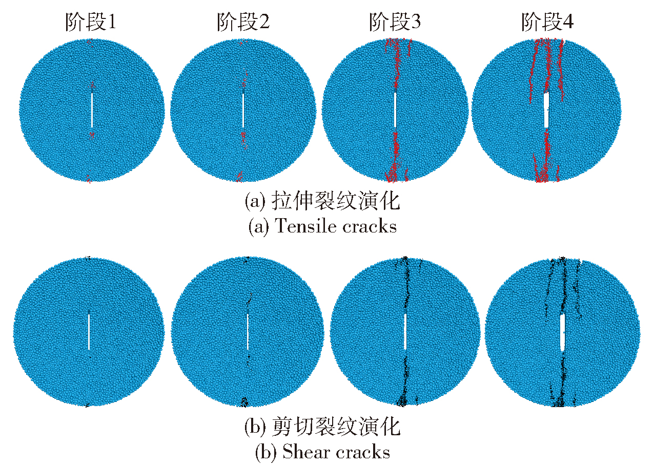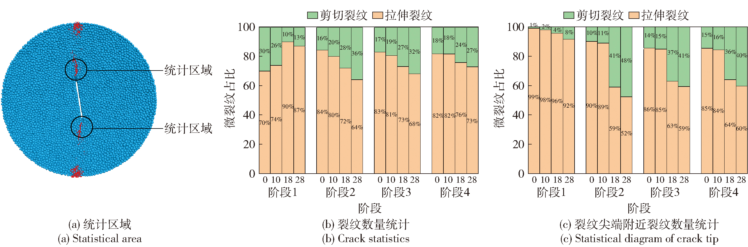 摘要: 为研究混凝土中损伤演化过程,采用离散元方法对不同加载模式下含预制裂纹混凝土试件的裂纹起裂和扩展演化过程进行数值模拟。基于混凝土材料中骨料几何特征,构建了具有不规则多面体骨料的三维混凝土离散元模型;并采用平节理模型对4种加载模式下的混凝土试件中裂纹产生和扩展行为进行研究,揭示了混凝土宏观失效破坏的细观损伤机理。结果表明:1) 加载初期,混凝土试件内部裂纹较少,由于压缩应力集中效应影响,剪切裂纹主要聚集在加载端两侧,而预制裂纹尖端则产生拉伸裂纹;加载后期,裂纹沿着骨料边界迅速扩展导致裂纹弯折扩展,加载端附近产生次生裂纹并向试件中部延伸,同时承载高应力的骨料内部出现少量裂纹。2) 加载角从0°增至28°时,预制裂纹尖端处的剪切裂纹占比呈现增加的趋势,体现了混凝土从拉伸破坏到剪切破坏的转变;4种加载模式下拉伸破坏仍是主导混凝土试件破坏的主要因素。3) 加载角度在0°~28°范围内,预制裂纹尖端处的起裂角随加载角增大而增大;采用广义最大切应力准则预测结果在纯Ⅰ型及Ⅰ-Ⅱ混合加载阶段与模拟结果吻合性较好,在纯Ⅱ型加载下预测结果偏高。