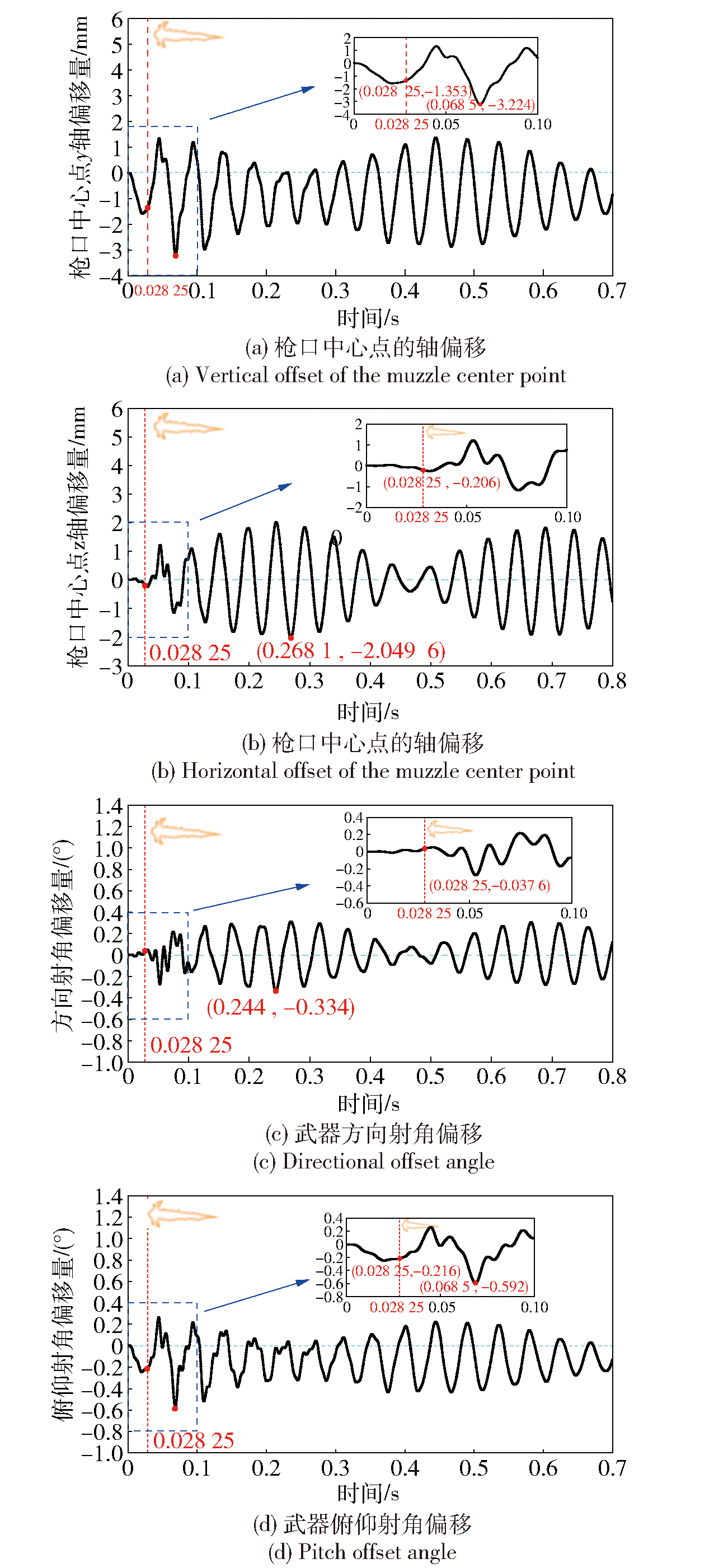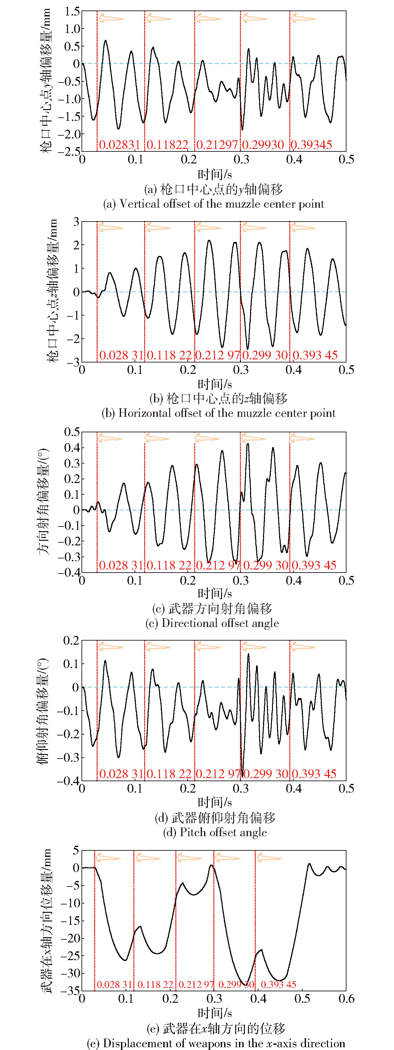 摘要: 为提升轻型遥控武器站的精确打击能力与环境适应性,需要对发射载荷作用下武器站的力学特性及射击扰动进行研究,选取某小口径突击步枪为研究对象,在与之匹配的轻型遥控武器站结构基础上,借助ADAMS-Simulink联合仿真,构建了系统的刚柔耦合发射动力学模型,并就单、连发两种工况下系统的射击过程进行了仿真分析;此外,基于仿真结果对遥控武器站装夹模块进行了优化,在武器与装夹结构之间引入了缓冲器,并对优化前后的系统进行了实弹试验验证。结果表明:在单发射击工况下,枪弹发射至电机首次冲击力矩峰值的响应时间在35ms内,且方向电机受冲击更为显著,峰值达182.98N·m; 在连发射击中,残余能量与新一发冲击载荷耦合使电机力矩振荡幅值突增约50%;此外武器自身的射频不稳定性也对射击扰动产生影响。仿真结果与实弹试验结果吻合较好,验证了刚柔耦合发射动力学模型建模的准确性。通过引入缓冲器,可显著降低电机所受冲击力矩和射击扰动,五发连发下的百米半数散布圆半径降低45.8%,显著提升了射击密集度与系统射击精度。