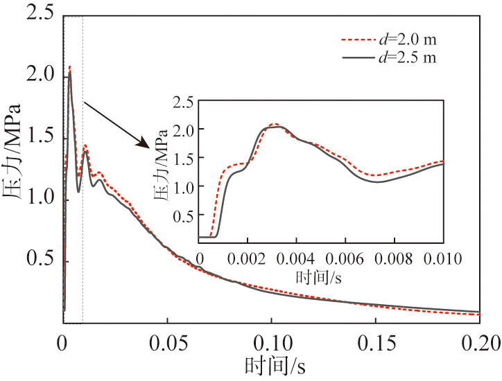 Fig.5 Shockwave pressure histories of two gauge targets with standoff distances of 0 and 5.0cm along the explosive center adjacent to the rigid surface