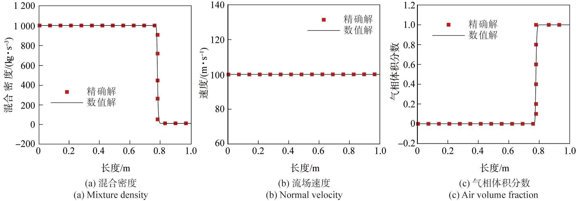 Fig.4 Distribution diagram of mixture density,normal velocity,and air volume fraction of an interface in a uniform pressure and velocity flow problem at t=2.79ms