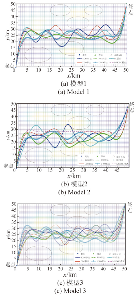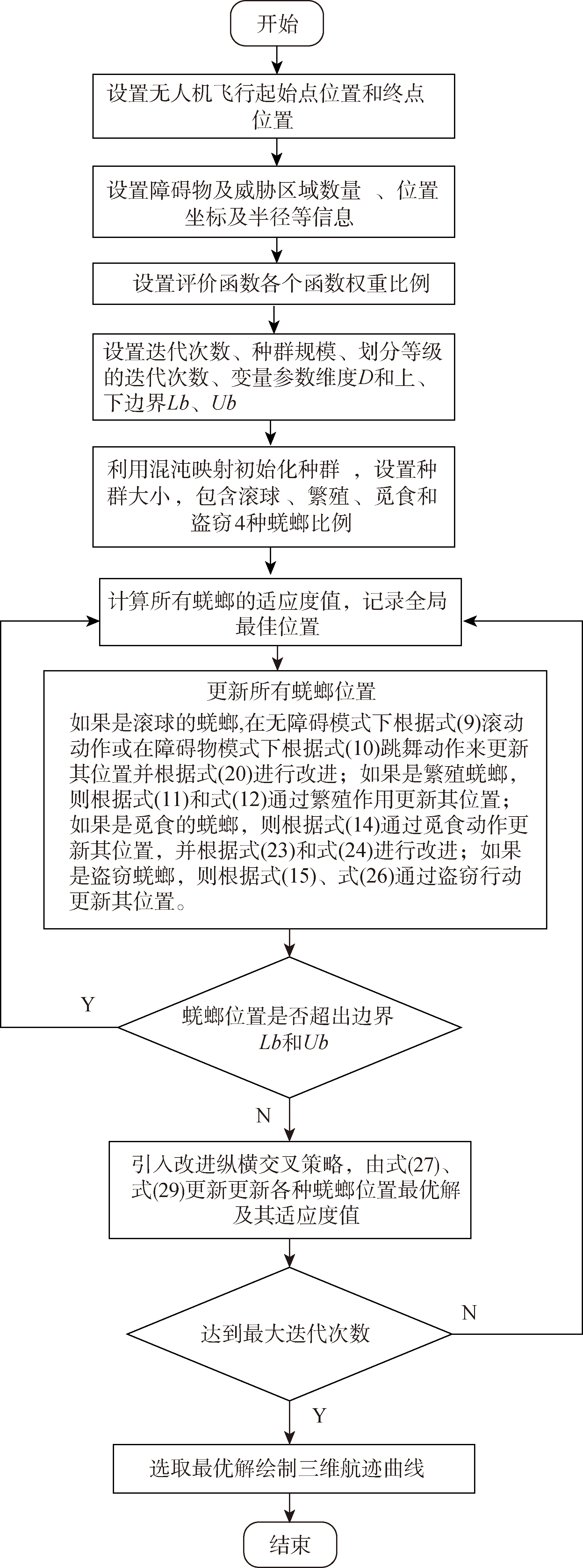 The traditional dung beetle intelligent optimization algorithm has good global search capability,but its performance is affected by the initialization parameter settings,which can lead to problems suchas blind spots in the local search,and non-communication between populations,etc.To address the problem of search blind spots in identifying the threats or no-fly areas for 3D trajectory planning of UAVs,a multi-strategy improved dung beetle optimization algorithm is proposed to improve the global trajectory planning capability.The initialization parameters,dung beetle ball-rolling behavior,small dung beetle foraging behavior and dung beetle stealing behavior are improved by using a novel chaotic mapping,a novel Cauchy-Lorenz wandering strategy,an improved triangular wandering strategy,and a novel Cauchy's inverse cumulative distribution function wandering strategy,respectively.The dung beetles of each population are crossed by using an improved longitudinal and transversal crossover strategy,and the ability of the UAV to identify the threat areas and the global trajectory planning is enhanced by the improvement of the multi-strategy.The results show the superiority of theimproved dung beetle algorithm in UAV trajectory planning.The total cost of the improved optimization algorithm is only 57.88% of the cost of the traditional dung beetle intelligent optimization algorithm,which is reduced by 42.12%.Compared with the total costs of the sand cat swarm algorithm,the particle swarm algorithm,the hippopotamus algorithm,and the gray wolf algorithm,the total cost of the proposed algorithm is reduced by 38.37%,38.80%,44.17% and 41.80%,respectively.